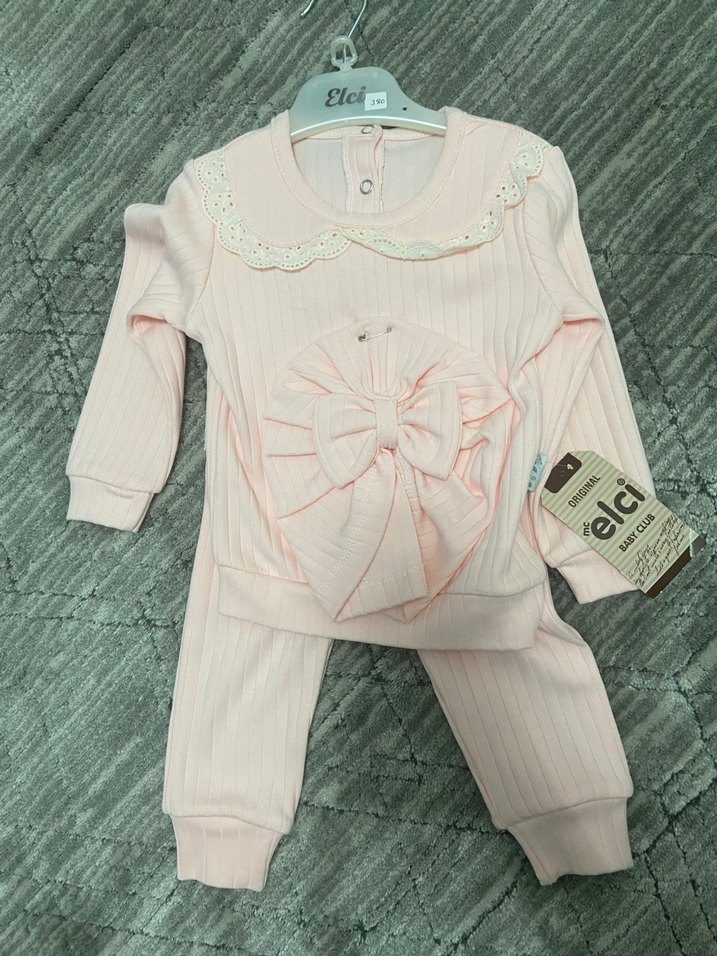 Pastel pembe renkli, uzun kollu bebek kız takımı. Dantel yaka ve önünde büyük fiyonk detayı bulunur. Kumaşı yumuşak ve çizgilidir.
