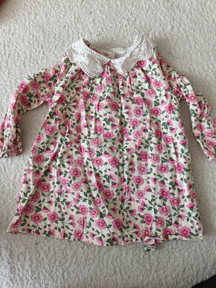 Uzun kollu, dantel yakalı, yumuşak triko kumaştan yapılmış, bol kesim pembe çiçekli bohem kız elbisesi.