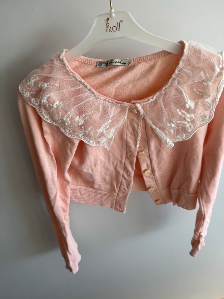 Pembe pastel renkte, uzun kollu ve dantel işlemeli yakası olan, ince kesim kız bolero.