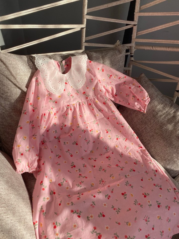 Pamuklu, bol kesim, uzun kollu, dantel yakalı, pastel pembe renkli çiçek desenli bohem kız çocuk elbisesi. Kişiye özel ölçülerde dikim yapıyorum. Farklı kumaş seçenekleri mevcut.