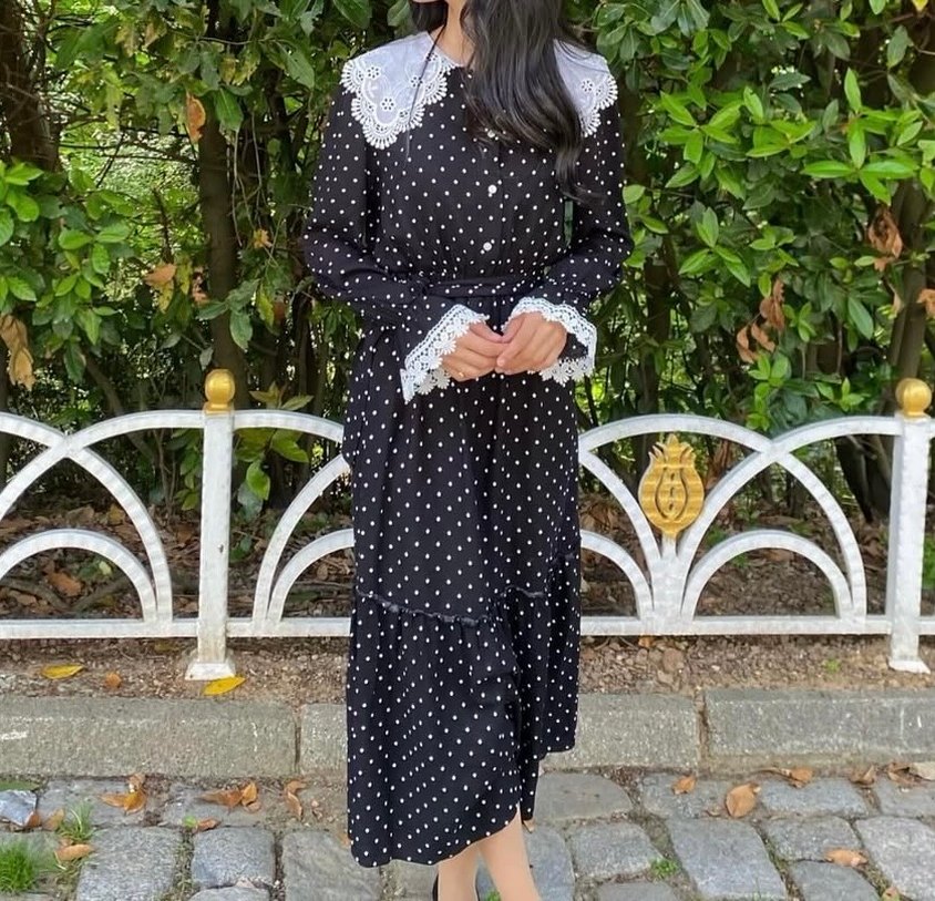 Beyaz puantiyeli siyah uzun elbise, dantel yakalı ve manşetli, uzun kollu, notched lapel yakalı ve retro bohem tarzda.