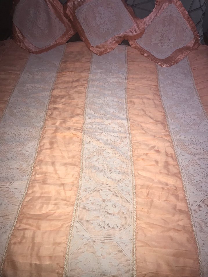 Dantel desenlere sahip açık tonlarında yatak örtüsü. Yumuşak dokulu saten kumaş ve uyumlu işlemeli yastık kılıfları 3 tanedir Özel dikim el emeğiyle buluştu