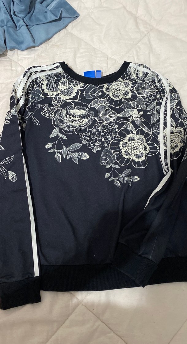Uzun kollu, bol kesim siyah sweatshirt, baskılı çiçek desenleri ve dantel detaylarıyla, günlük rahat sokak stiline uygun.