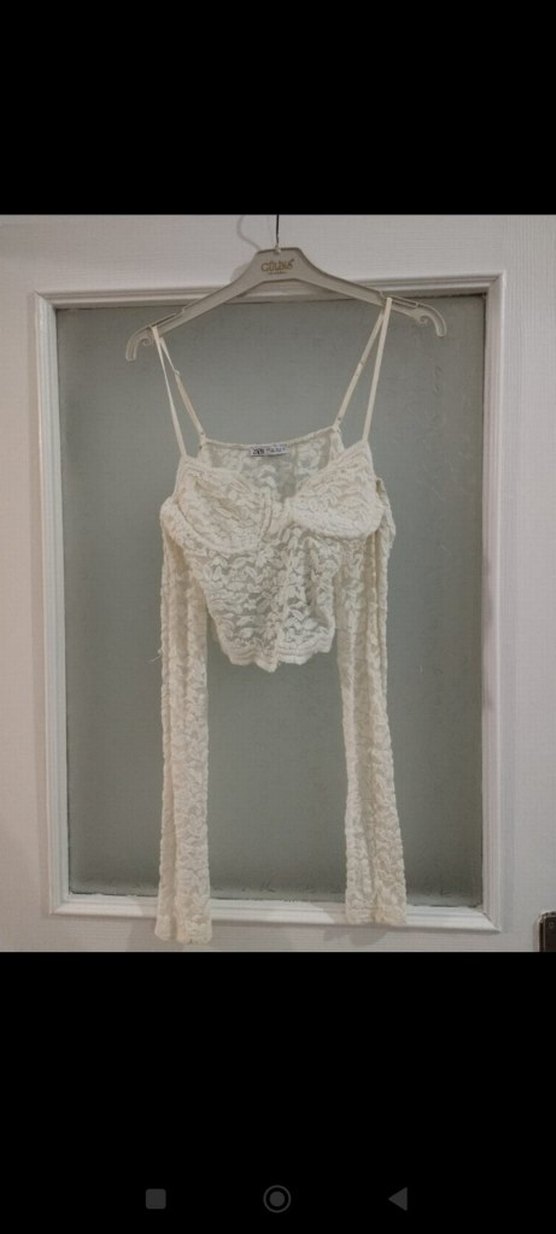 Yumuşak dokulu beyaz, dantelli ve ince askılı, kısa boy fitted büstiyer. Bohem tarzda şık bir görünüm sunar.