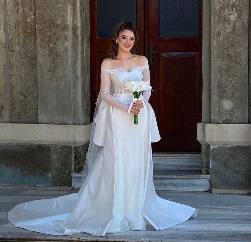 Özel tasarım ve dikim kuyruğu çıkarılabilen fransız danteli gelinlik 34-36 beden uyumlu sırtından ip bağlamalı