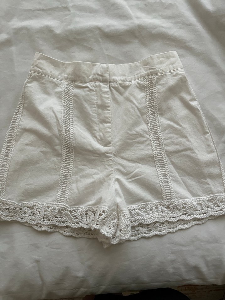 Pamuk kumaştan yapılmış, dantel süslemeli beyaz mini şort. Nakış detayları ve oturan bohem tarzıyla günlük kullanıma uygun.