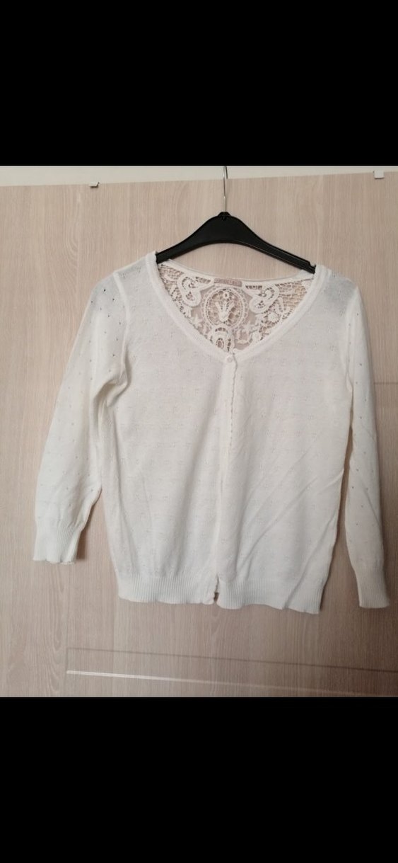 Uzun kollu, dantelli sırt detayı olan beyaz triko hırka. V yaka, bol kesim ve midi uzunlukta, bohem tarzda rahat bir model.