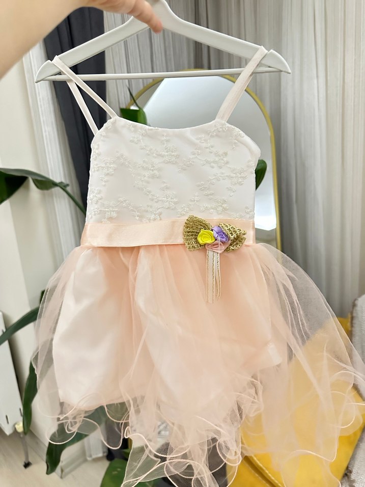 Dantelli beyaz üst kısmı, askılı ve straplez kesimiyle, pastel tül etekli kız elbisesi. Fiyonk detaylı, bohem tarzda şık bir model.