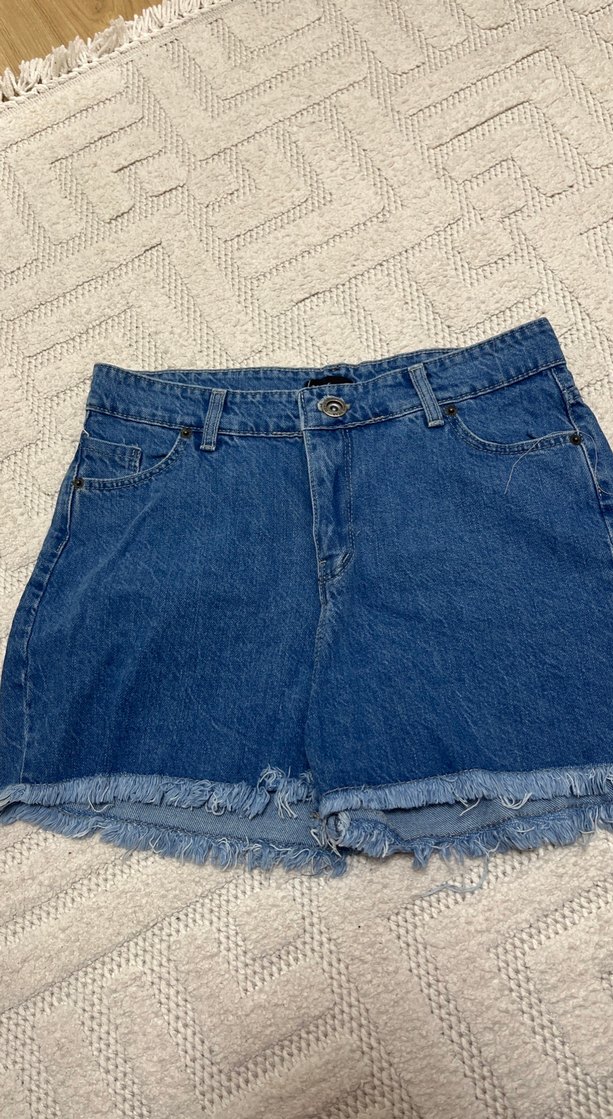 Dantelli ve püsküllü kenar detaylı bol kesim mini kot şort, günlük rahat kullanıma uygundur. Mavi renkte ve salaş tarzda.