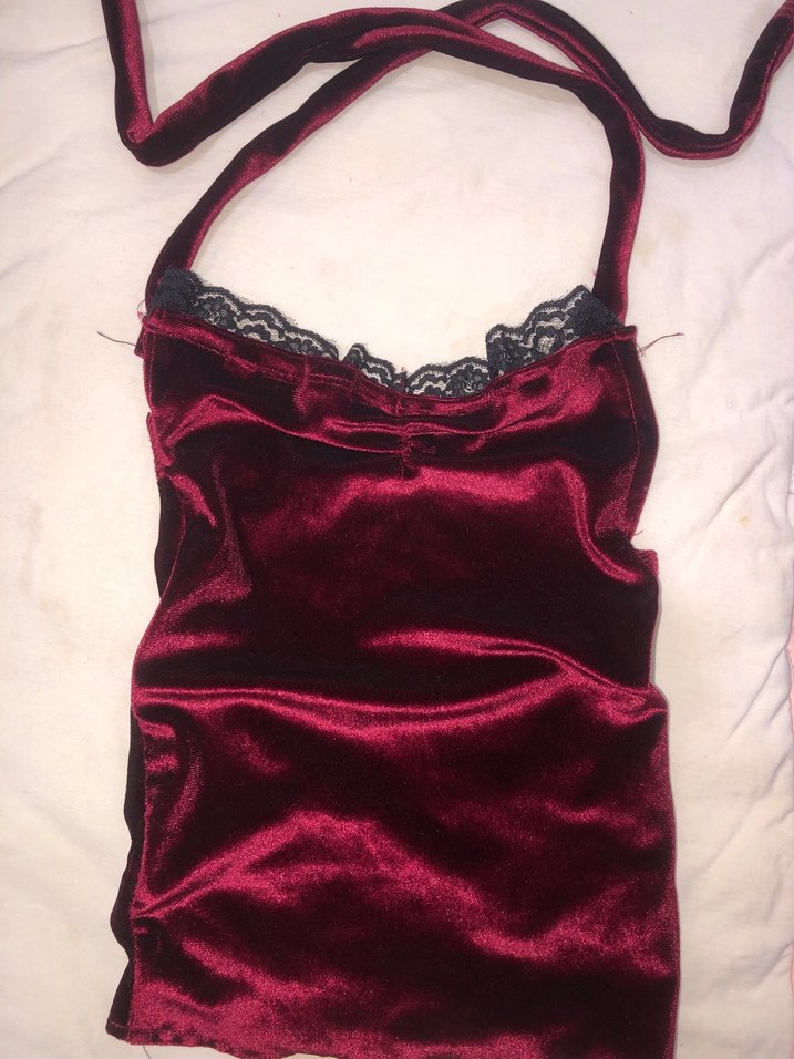 Koyu bordo renginde, kadife kumaştan yapılmış gotik tarza uygun .İnce dantel detaylarıyla tamamlanmıştır.