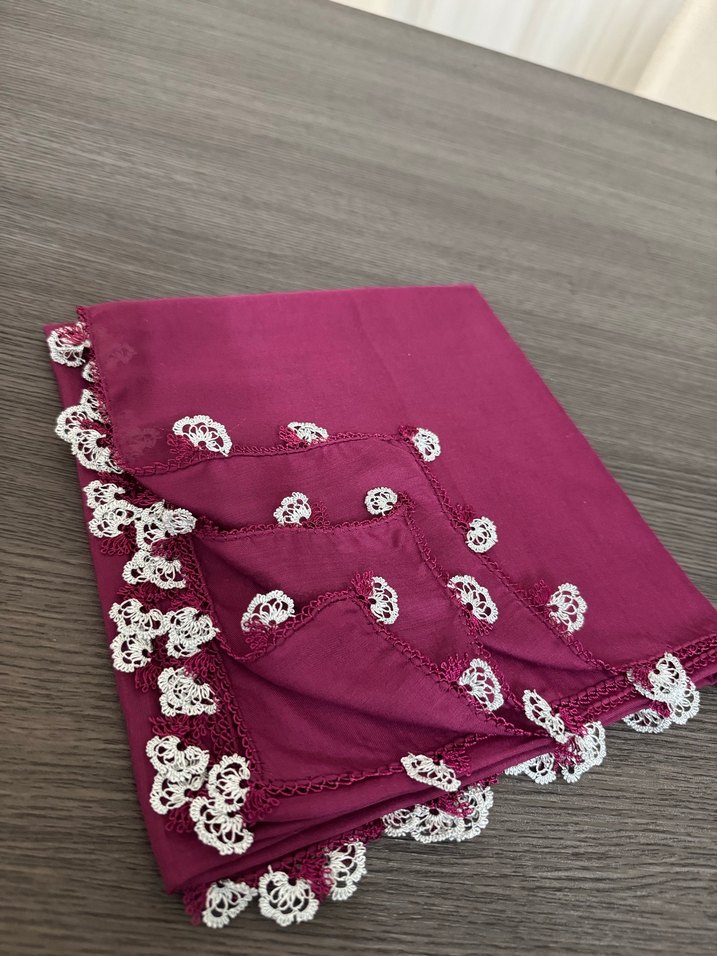 Bordo renkli tekstil fular, beyaz dantel detaylarıyla bohem ve retro tarzı yansıtır. Sıcacık ve şık bir görünüm sunar.