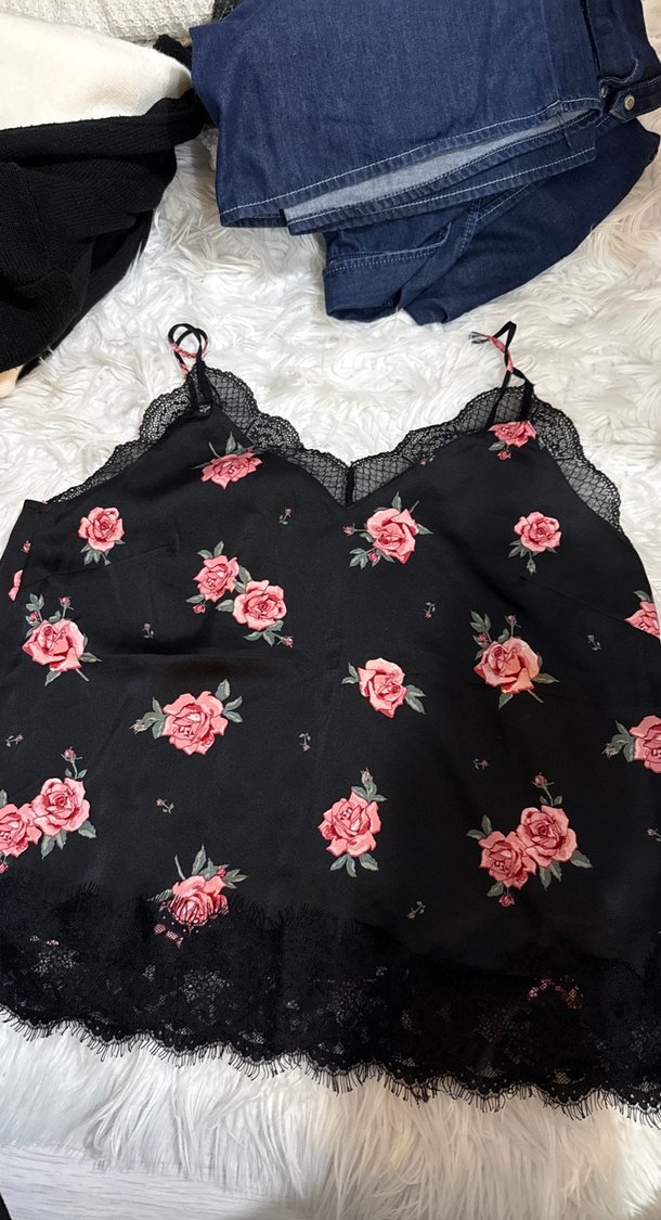 Koyu pembe çiçek desenli, V yakalı, dantelli ve askılı mini bustiyer. Rahat kesimiyle romantik akşamlar için uygundur.