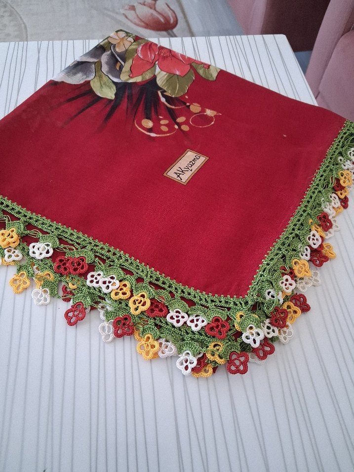 Çiçek desenli, çok renkli kadın oyalı yazma zarif dantel kenar süslemeleriyle bohem tarzı yansıtıyor.