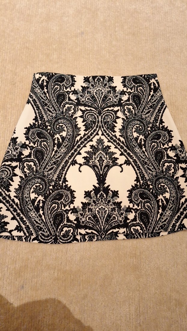 Dantelli detaylı, bej zemin üzerine koyu desenli, bohem Paris tarzı klasik kesim midi mini etek, ofis kullanımı için uygundur.