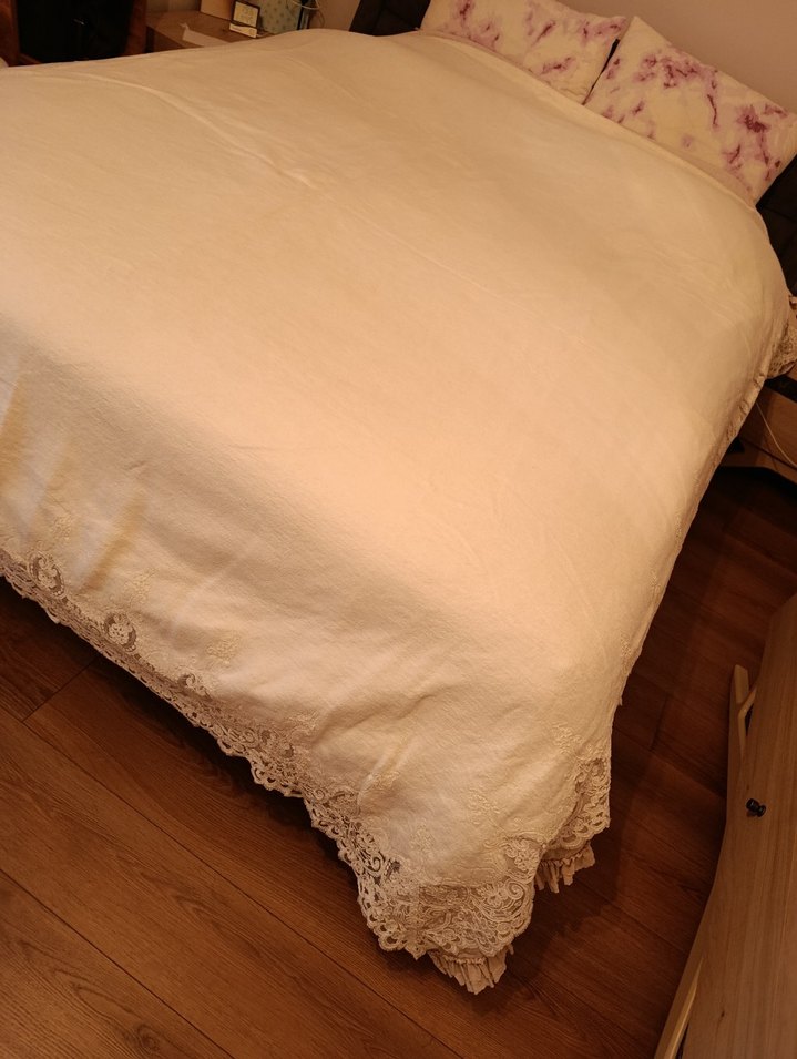düz desene sahip, kenarları ince dantel detaylı yatak örtüsü. Pastel tonu yatak odasına sakin ve zarif bir hava katar. ️