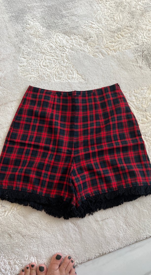 Kırmızı ve siyah ekose desende, dantelli kenar detaylı, bol kesim mini şort. Rahat ve gotik tarzı romantik buluşmalar için bir araya getirir. ❤️