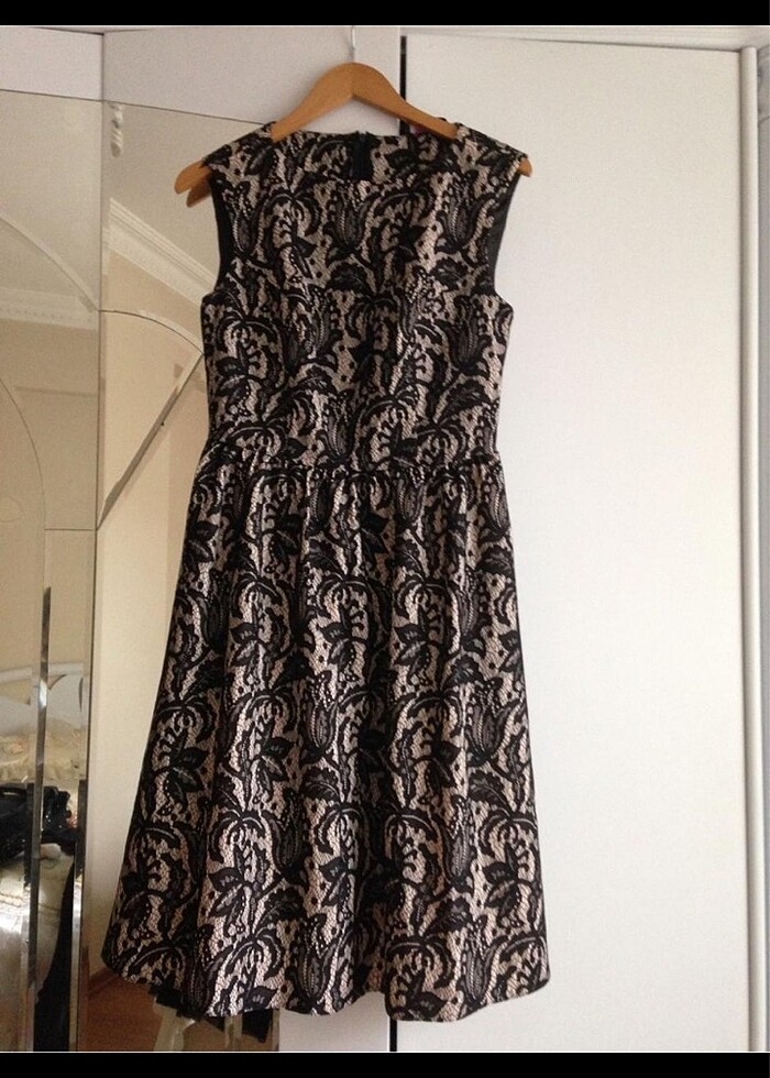 Dantel görünümlü bir kumaşı var.Üst kısım astarlı .Kayık yaka.Arkada bele kadar fermuarlı .G 44, b 102 cm .Sıfırdır.Dış etiketi Yok