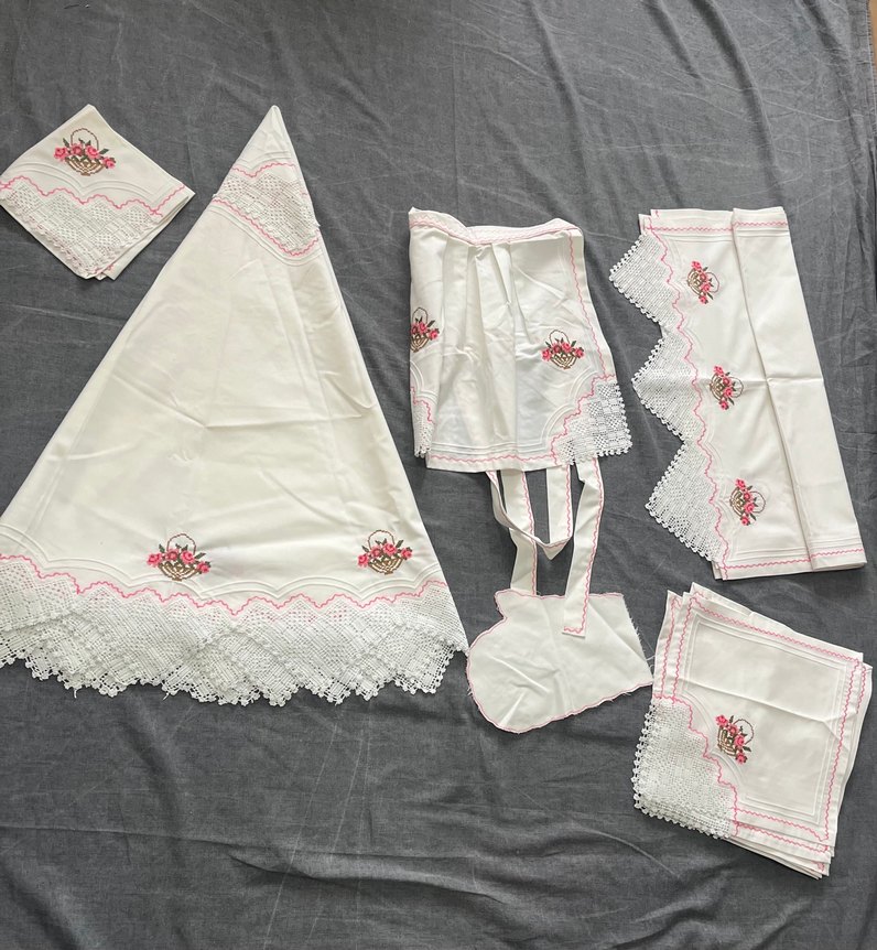 İşlemeli çiçek desenleri ve ince dantel kenarlarıyla beyaz masa örtüsü ve peçete seti, sofranıza klasik bir dokunuş katıyor 11 parça çok zarif ve kibar bir set