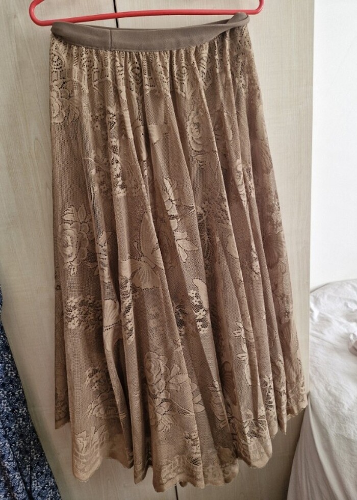 Uzun etek. Tatlı dantel detaylı astarı mevcut ben tesettürlü olduğum için astarı biraz kısa geldi o yüzden satıyorum. Yeni bir astarı diktiniz kullanmak istedim ama bir türlü fırsat olmadı . Alıcısına hayırlı olsun .