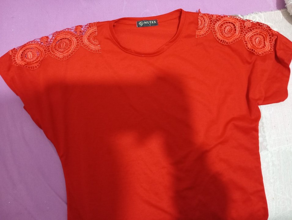 Kısa kollu, yuvarlak yakalı kırmızı tişört, omuzlarında dantel detaylarıyla. Minimalist ve renkli tasarımıyla günlük kullanıma uygun.