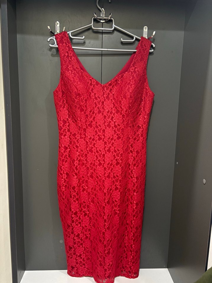 V yaka, kolsuz, dantelli kırmızı midi elbise, vücuda oturan kesimiyle romantik akşamlar için ideal.