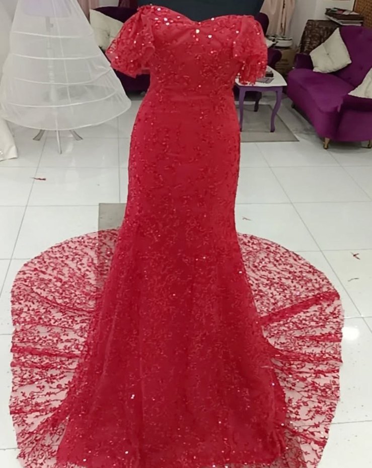 Dantelli ve kayık yaka uzun kırmızı abiye elbise, klasik ve zarif bir görünüm sunar. Düzenli kesim ve renkli desenlidir.