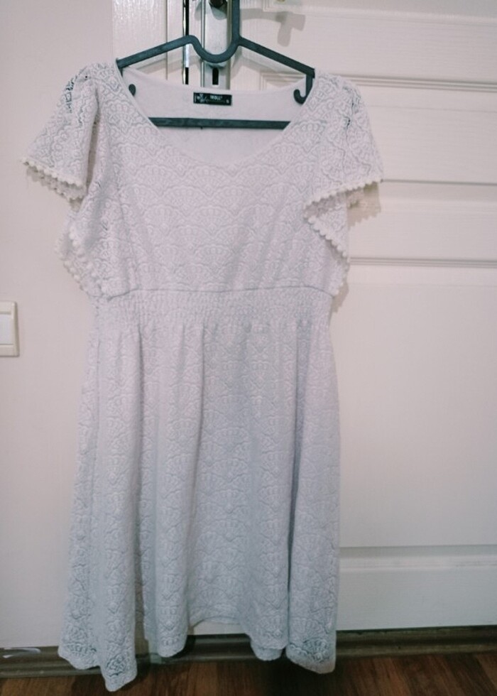 hiçbir yırtığı söküğü yoktur S-M bedene uyumludur yıllardır dolapta bekleyen bi elbise artık olmadığı için satıyorum kırık beyaz veya krem gibi bir renkte beyaz değil altta astarı mevcut. boy 82 cm iki koltuk arası 42 cm lastikli bel kısmı esnetmeden 36 cmdir 6-7 cm daha esniyor. #kısaelbise #kadıngiyim #dantellielbise