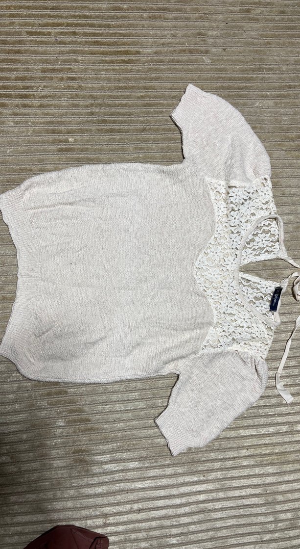 Bej renkli, kısa kollu ve yuvarlak yakalı kadın kazak. Örgü kumaştan yapılmış, dantel detaylarıyla rahat ve şık bir görünüm sunar. Günlük kullanıma uygundur.