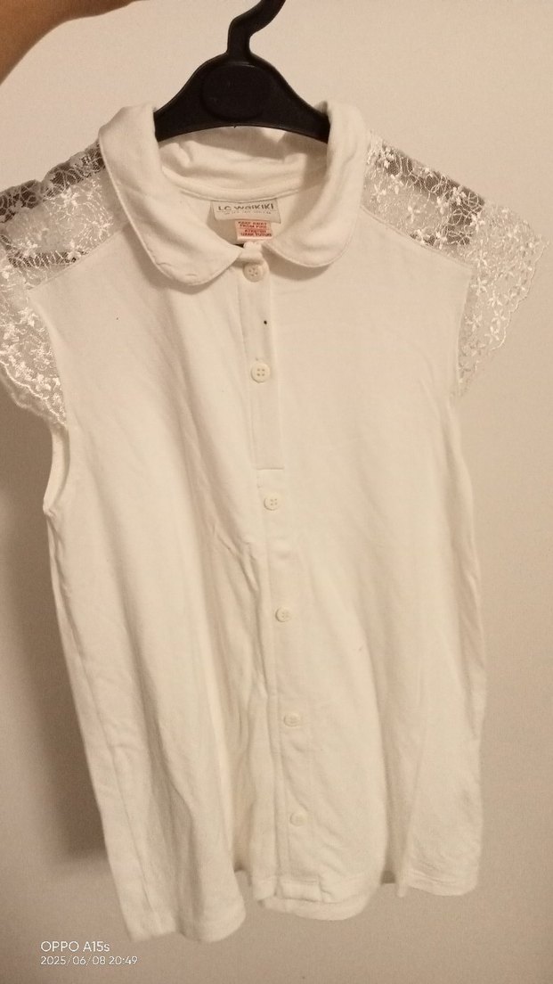 Pamuklu, dantelli kısa kollu ve yakalı beyaz gömlek. Rahat kesimiyle günlük sokak stiline uygun, pastel tonlarda kız çocuk gömleği.