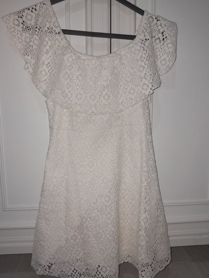 Beyaz bohem tarzda, kısa kollu, tekne yaka ve bol kesim mini dantelli kız elbisesi zara