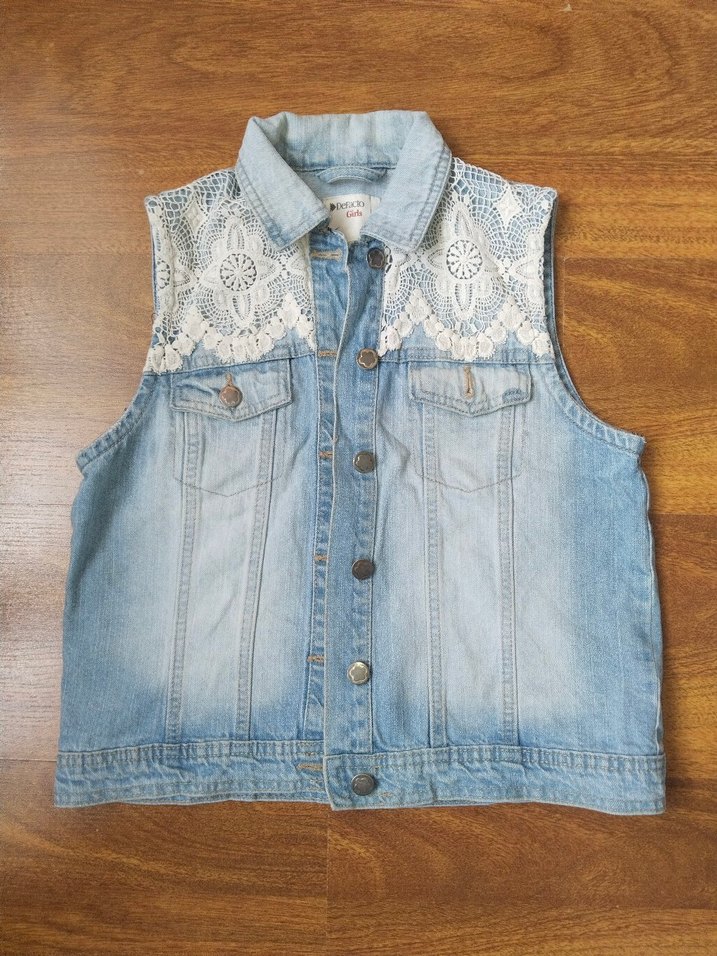 Kolsuz, dantelli omuz detaylı ve nakışlı desenli, normal boy bej pastel tonlarda, kesik yakalı, dar kesim denim yelek.