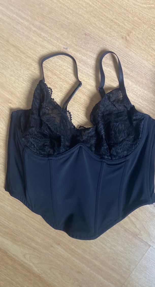 Dantelli detaylara ve ince askılara sahip, gotik tarzda lacivert, vücuda oturan straplez büstiyer. Romantik akşamlar için uygun. ✨