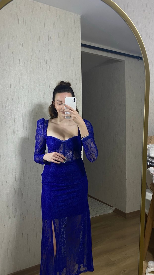 Bu dar kesim, uzun abiye elbise, straplez yaka ve uzun kollu lacivert dantel kumaştan yapılmıştır. İnce yılan derisi desenine sahiptir, romantik gece için cesur ve göz alıcı bir seçimdir.