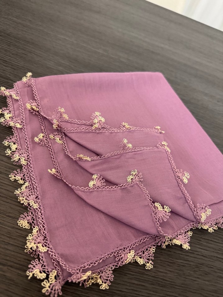 Pastel mor renkli, dantelli kenar detayına sahip kadın şalı, bohem ve retro tarzını yansıtıyor.