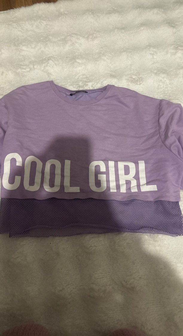 Pamuk kumaştan, mor renkli, uzun kollu, baskılı "COOL GIRL" yazılı ve etek kısmı dantelli, fitted kesim kız sweatshirtü.