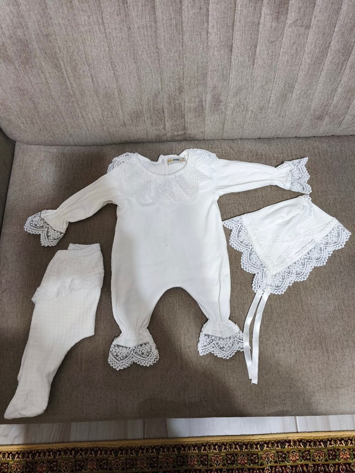 Uzun kollu tulum, çorap ve dantelli kapüşonlu şapka içeren beyaz bebek kız takımı, nakış ve dantel detaylarıyla şık görünüyor.