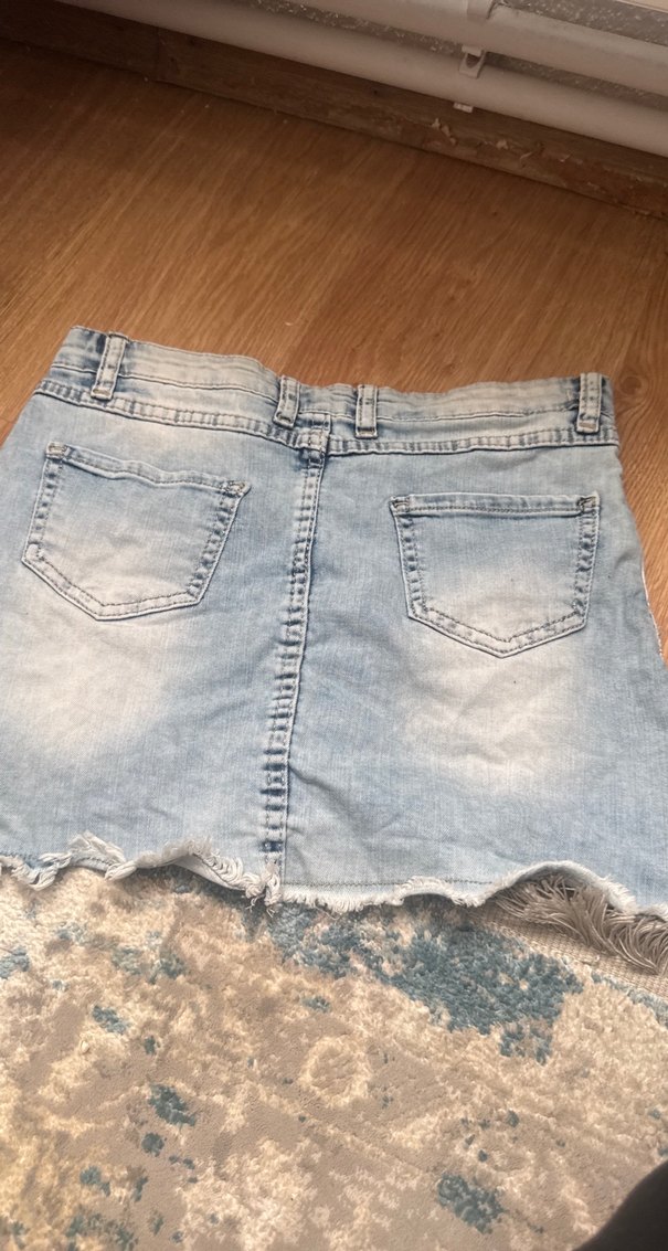 Dantelli ve nakışlı detaylara sahip mavi kot mini etek, bol kesimiyle bohem tarzını yansıtıyor. Kısa boyu ve rahat yapısıyla günlük kullanıma uygundur.