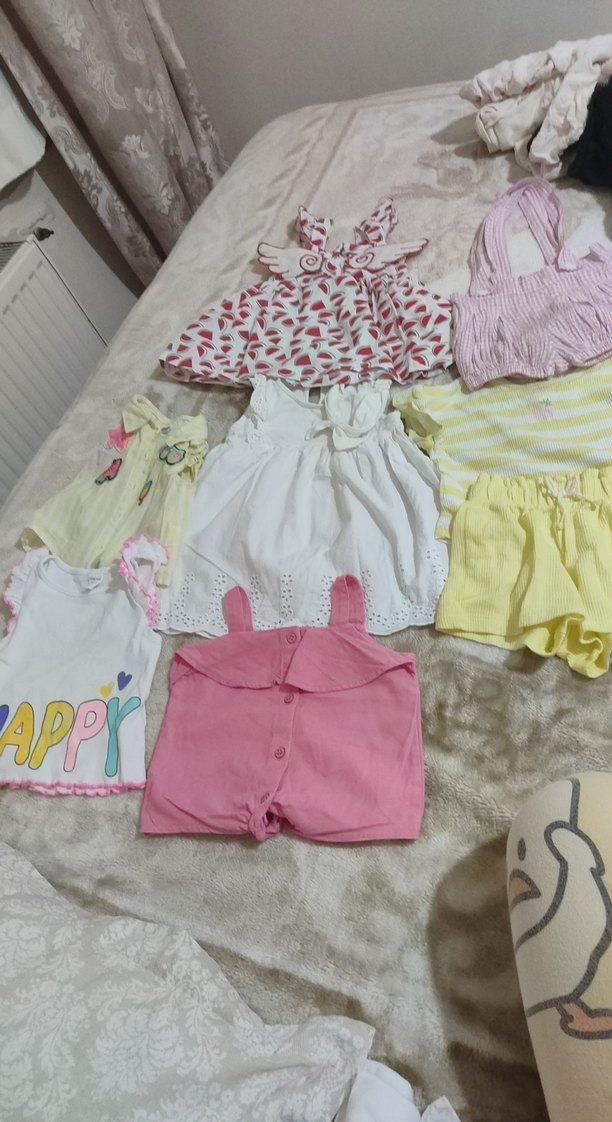 Nakışlı desenler ve dantel detaylara sahip pastel pembe kolsuz bebek kıyafet seti, zarif bir görünüm sunar.