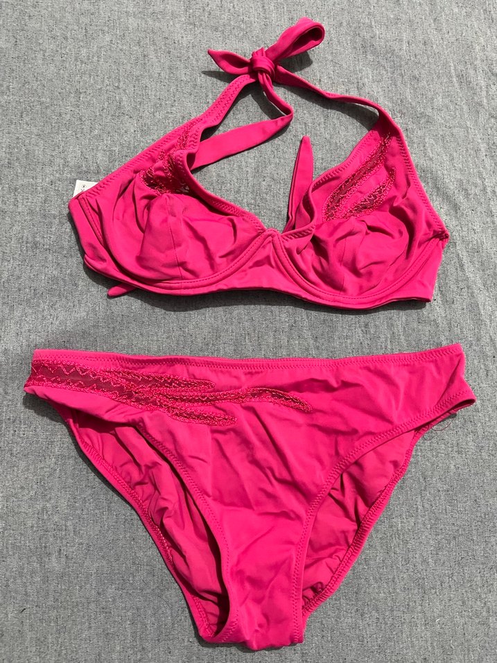 Dantelli detaylara sahip, askılı pembe bikini, plajda kullanıma uygun modern tarzda ve vücuda oturan kesimde.