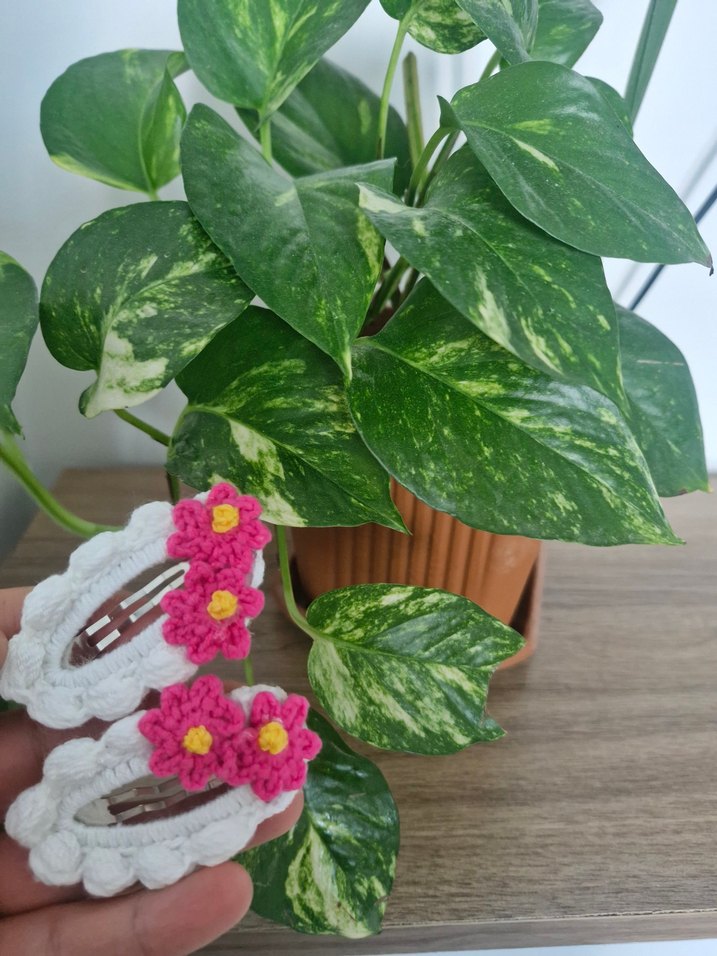 Bu set, beyaz dantelli kenarlara ve renkli pembe çiçekli örgü süslemelere sahip iki bohem tarzda çocuk tokası içerir.