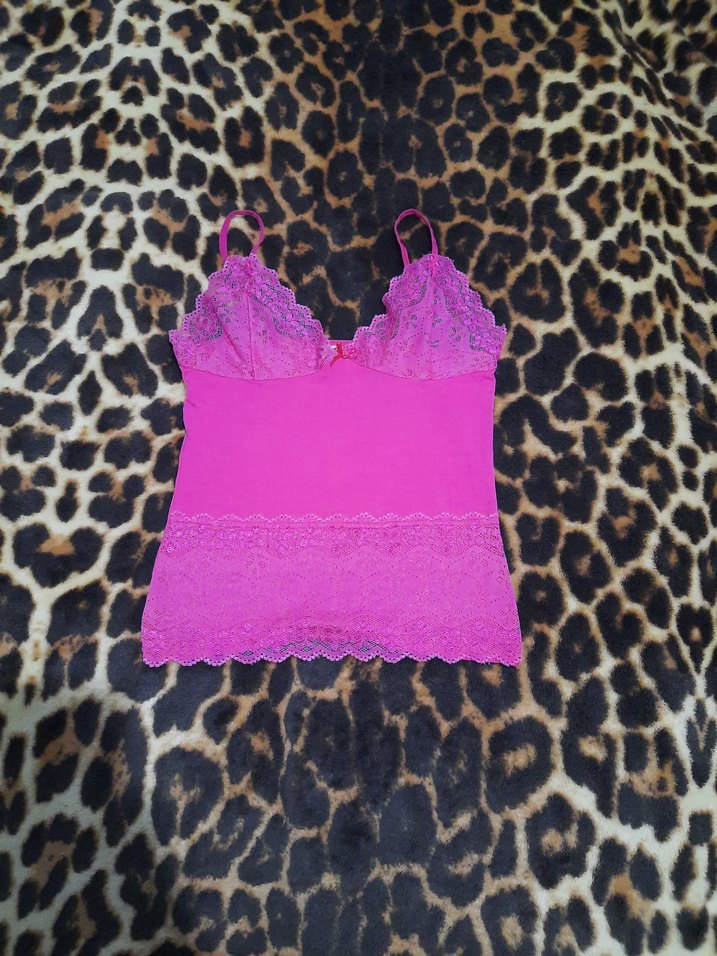 Dantelli ve ince askılı, pembe renkli kadın atlet, kısa boyda ve bohem tarzıyla dikkat çeker.