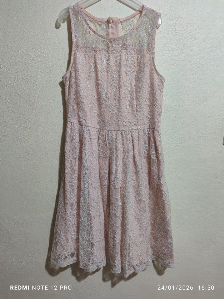 Dantelli, askısız yakalı, pembe kız çocuk elbisesi. Yumuşak örme kumaştan, bol ve bohem tarzda tasarlanmıştır.