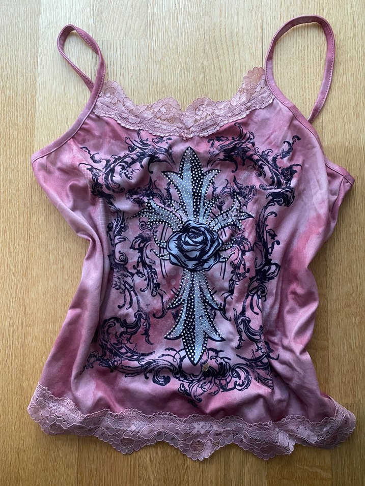 Pembe, dantelli ve V yakalı bu fitted askılı atlet, gotik tarzda çiçekli haç desenine sahip. İpek gibi kumaştan, romantik akşamlar için uygun.