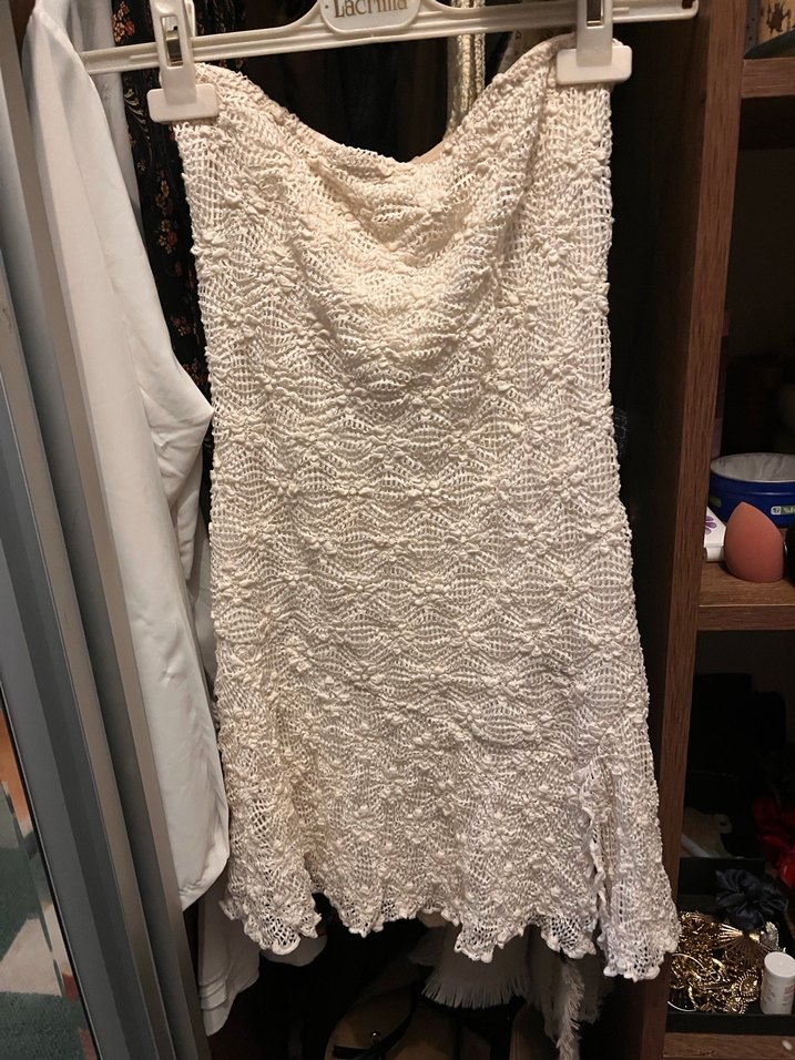 Dantel işlemeli beyaz, straplez ve kolsuz, vücuda oturan triko midi elbise, şık ve günlük kullanıma uygundur.