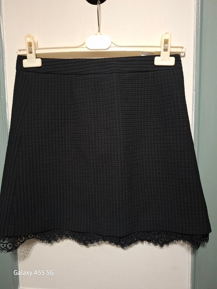 Dantelli ve işlemeli detaylı, siyah triko mini etek. Fitted kesim, pileli ve gotik Paris tarzında, günlük kullanıma uygun.