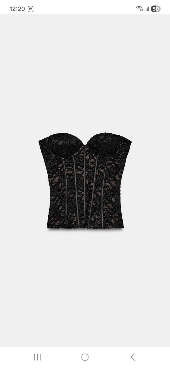 Siyah deri ve işlemeli dantel detaylı, straplez yaka ve vücuda oturan kesimiyle cesur gotik tarzı için ideal bir büstiyerdir.