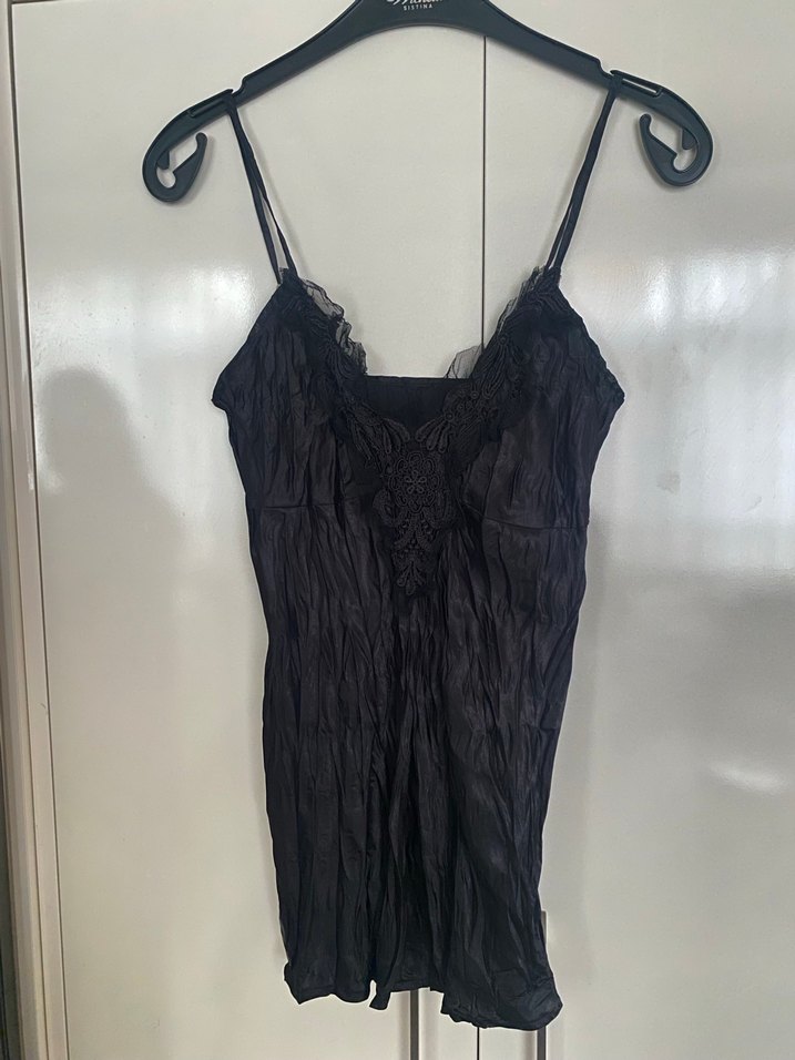Yumuşak satenemsi kumaştan yapılmış, dantelli ve ince askılı siyah, vücuda oturan bu gotik büstiyer, straplez yaka ve midi boyuyla romantik buluşmalar için uygun.