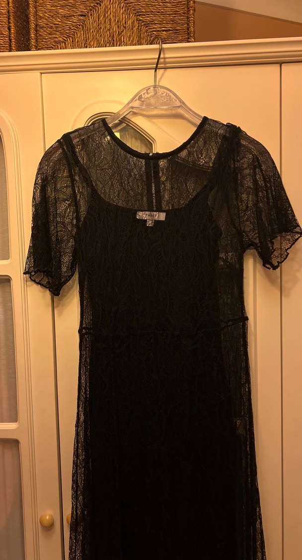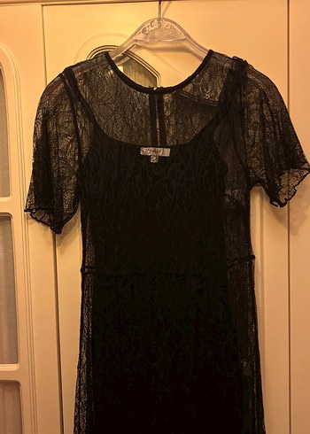 Dar kesim siyah gotik gece elbisesi, kısa dantel kollu ve tekne yakalıdır. Midi boy ve şeffaf dantel detayları romantik ve avangart bir görünüm sunar.