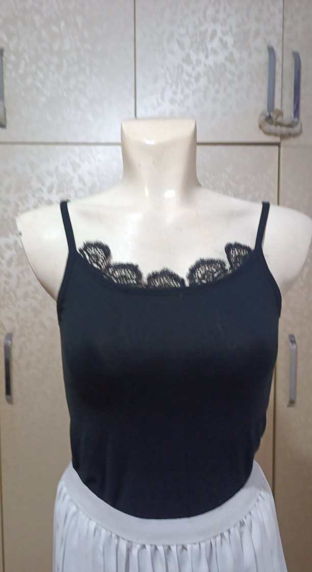 Dar kesim siyah ince askılı, dantel detaylı mini atlet. Sentetik kumaştan, nakışlı desene sahip, günlük kullanıma uygun gotik tarzda.