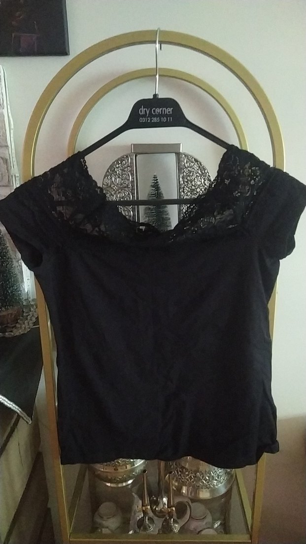 Dantelli tek renk siyah, kısa kollu, tekne yaka, vücuda oturan gotik stil bluz. İpeksi kumaştan, midi boyda, romantik geceye uygun.